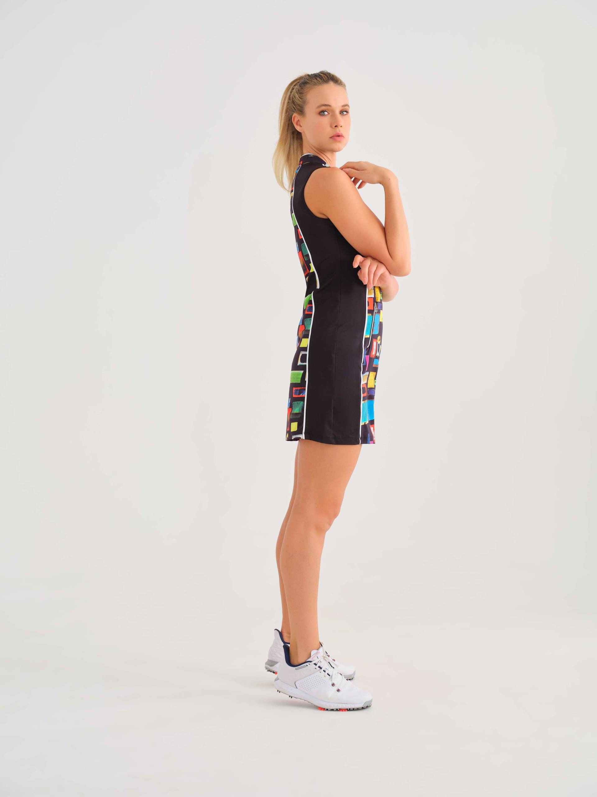 Bring bold colour and contemporary design to your active wardrobe with this Dolcezza ‘golf’ dress, featuring the expressive ‘Colourful Windows’ artwork by Azize Ickan. This sleeveless dress perfectly blends artful elegance with athletic performance. The mandarin-style stand-up collar with a 1/4 zip adds a polished, modern edge, while the printed front and back panels are beautifully balanced by slimming solid black side inserts.
