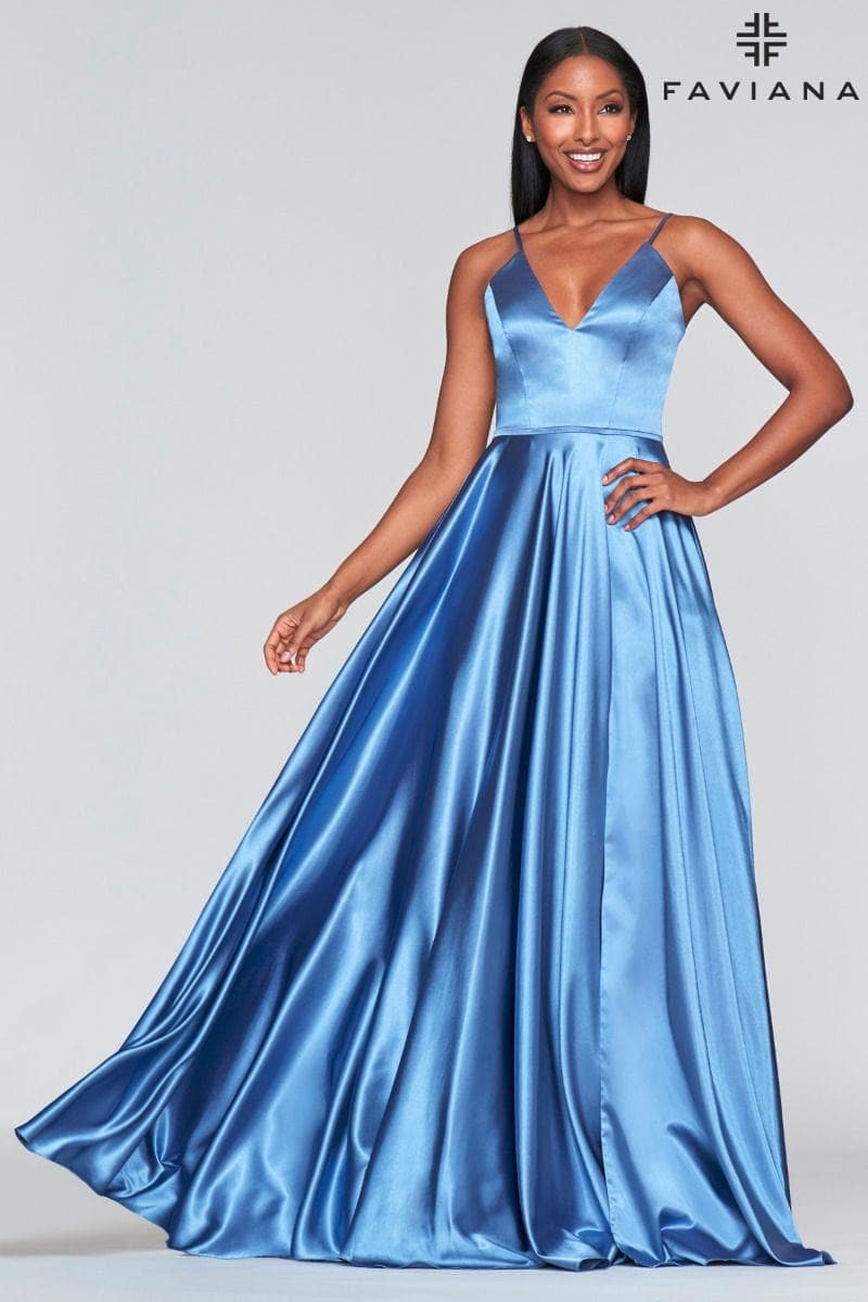 Faviana Style S10209 is elegant and timeless! With its stunning princess-cut silhouette, this glossy charmeuse dress flatters both slender and curvy figures. Featuring a deep v-neck and a low-cut back, adjustable laces make for a perfect fit. Practical side pockets keep your hands free to dance the night away, while a high slit shows off just the right amount of skin. Available in Deep Mauve, Buttercream, Emerald, Gold, Red, Steel Blue, and Wine, perfectly style this gown with studs, minimal bracelets, and wavy hair. Style S10209 is perfect for your prom, homecoming, a wedding guest, or New Year’s Eve!