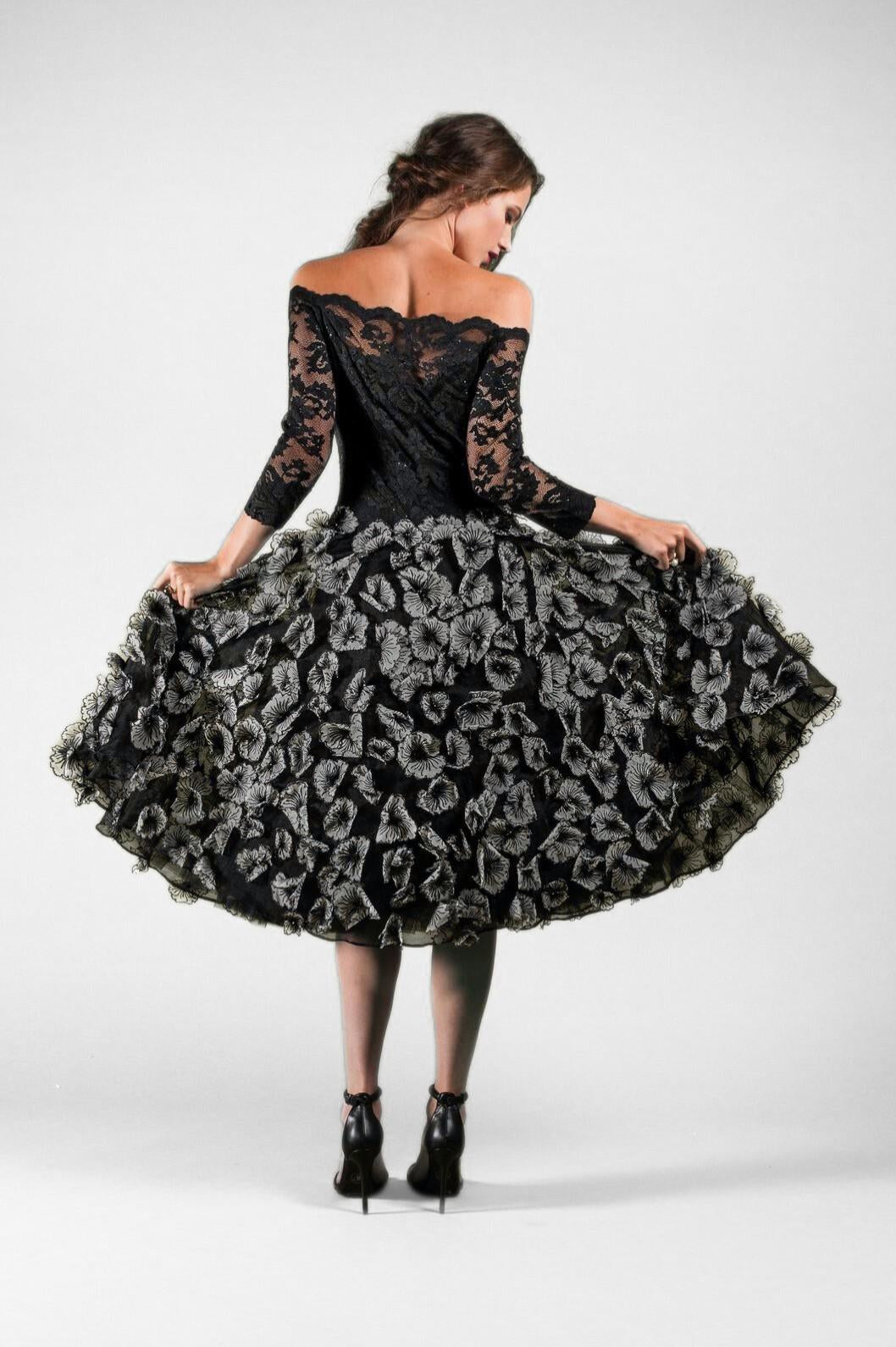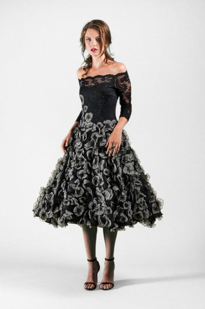 Make a bold statement with this enchanting black off-shoulder midi dress. The fitted lace bodice with three-quarter sleeves exudes sophistication, while the voluminous skirt is adorned with intricate floral appliqués for a dramatic and elegant effect.